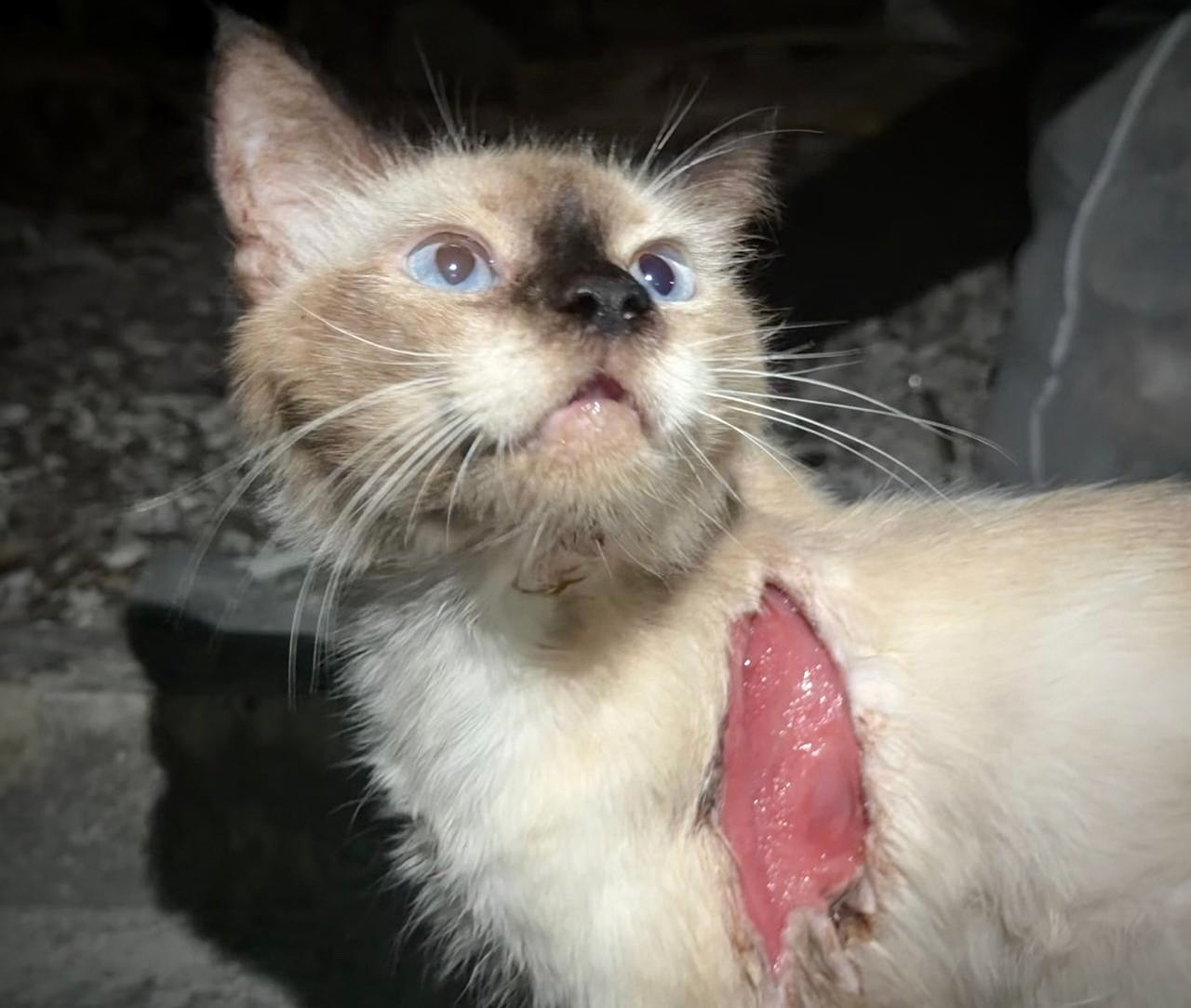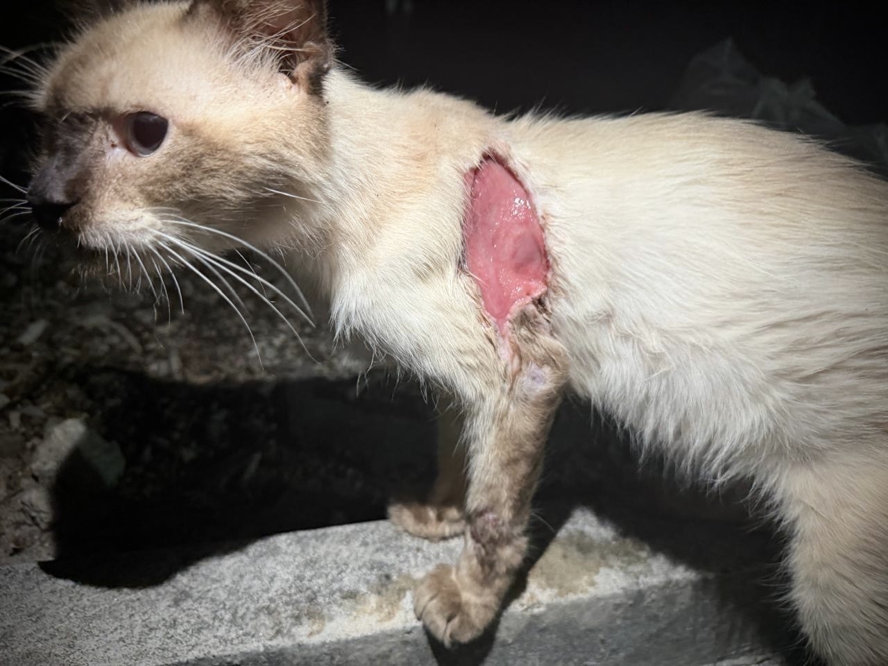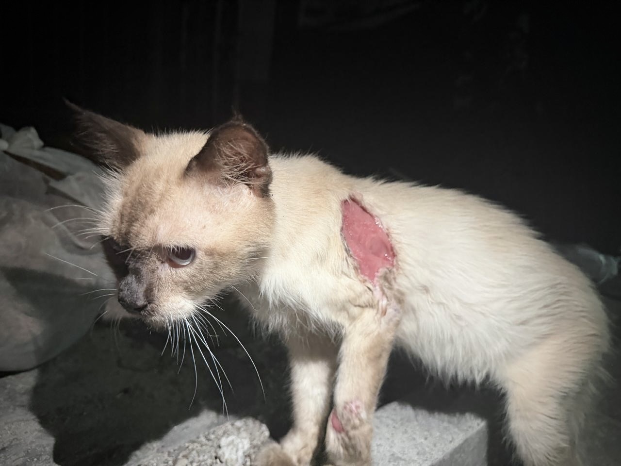 Kofi ma wielką ranę na plecach i drugą mniejszą na łapce. Oparzenia są bardzo głębokie, miejscami krwawią. Kiedy go znalazłam, siedział osowiały, bez ruchu. Nie reagował. Ale wtedy wyjęłam tubkę z kocią karmą. Kofi rzucił się na nią, jakby nie jadł od dawna. Połykał jedzenie bardzo szybko. Chyba się bał, że za chwilę zmienię zdanie i zabiorę mu tubkę. Potem położyłam mu trochę karmy na kamienny murek. Ją też pochłonął żarłocznie. A potem bardzo długo wylizywał beton z resztek zapachu i smaku jedzenia.